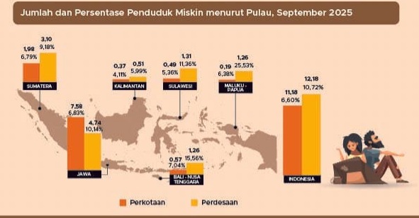 Secara geografis, disparitas kemiskinan antar-wilayah masih sangat mencolok. Pulau Jawa menampung jumlah penduduk miskin terbanyak dengan total 12,32 juta orang.