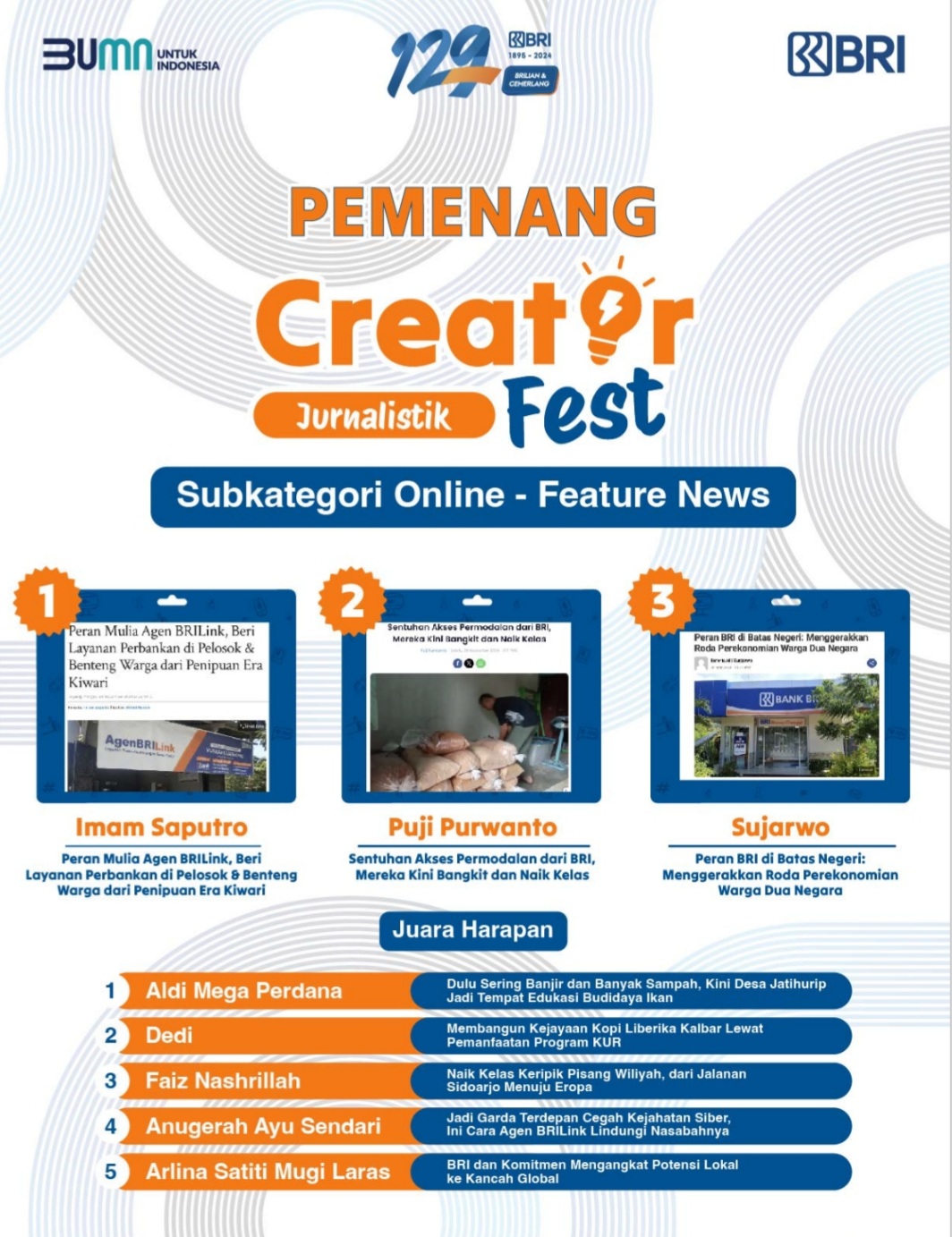 Ajang BRI Creator Fest itu telah berlangsung sejak 2 September – 30 November, dan hasilnya telah diumumkan pada situs dan media sosial resmi BRI, 14 Desember 2024.