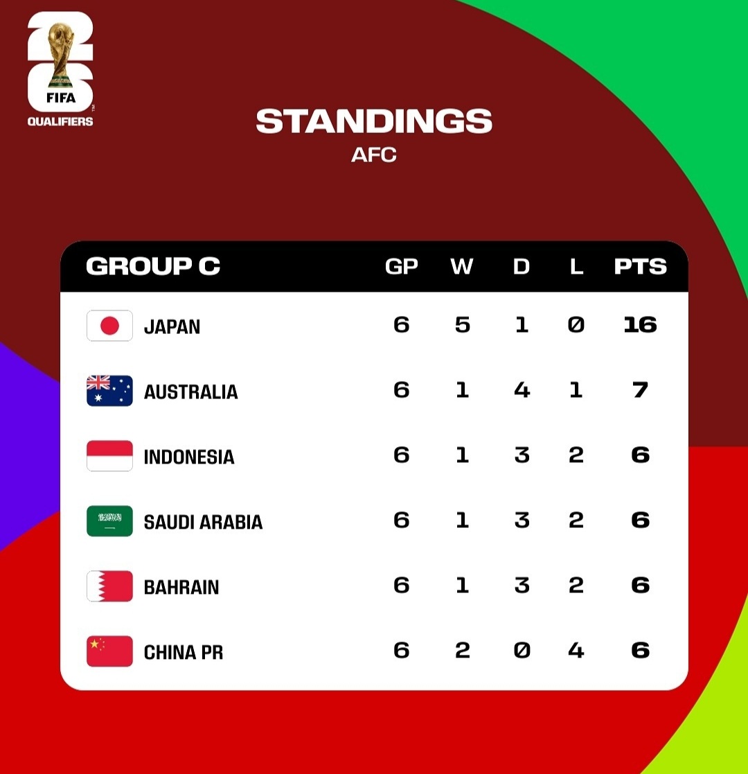 Timnas Indonesia di peringkat ketiga dengan Australia yang berada di peringkat kedua hanya tinggal berjarak satu poin pada klasemen Grup C. Begitu pula dengan tiga negara lainnya di bawah Indonesia, ada Arab Saudi, Bahrain, dan China yang juga sama-sama mengumpulkan enam poin.