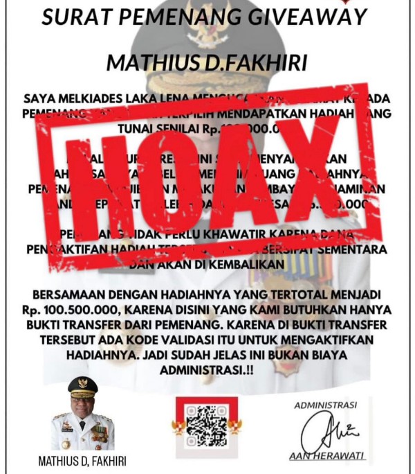 Jayapura, Euforia.id | Pemerintah Provinsi Papua menegaskan bahwa dokumen “Surat Pemenang Giveaway Mathius D. Fakhiri” yang beredar adalah Hoaks dan penipuan.