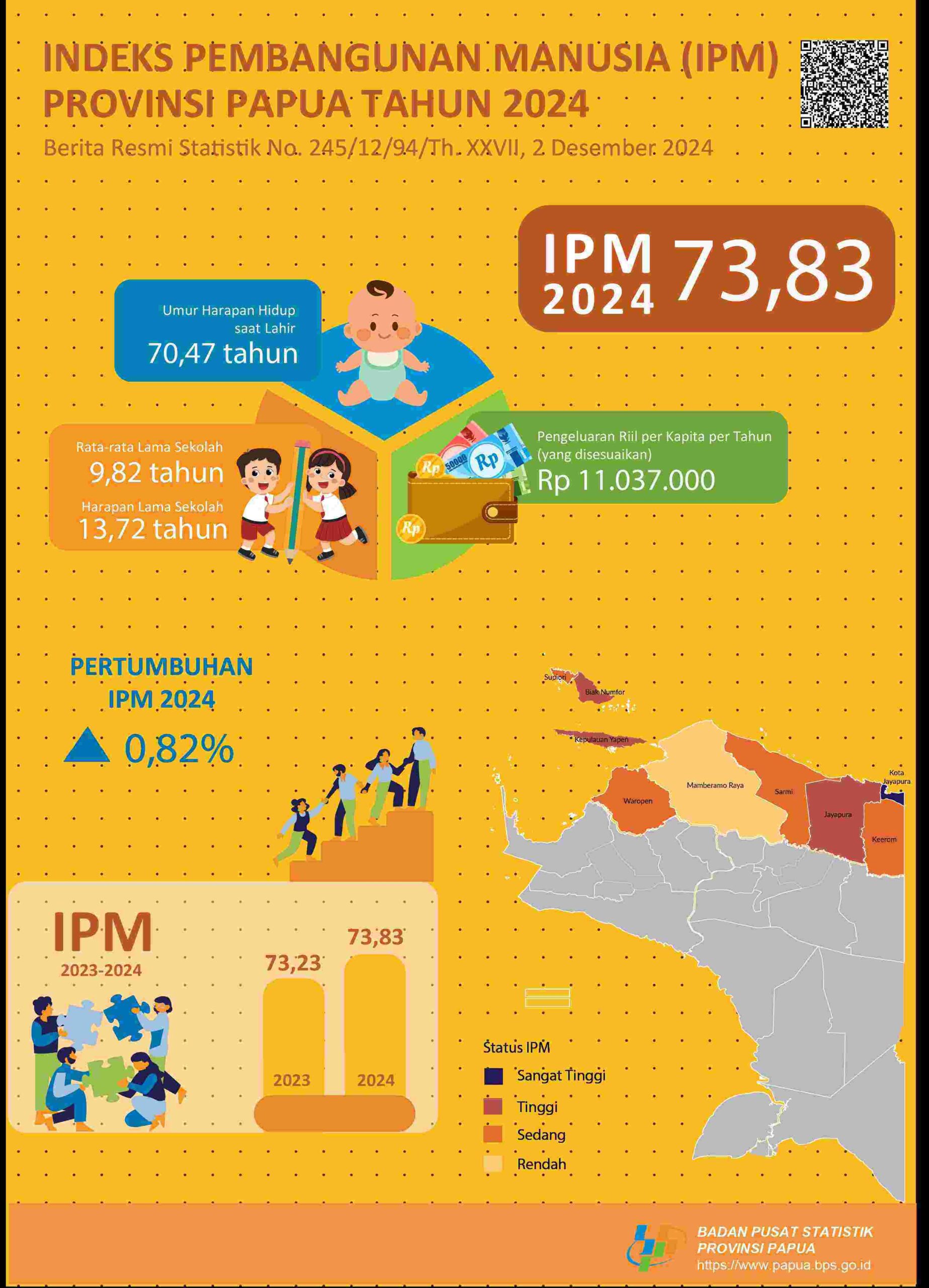 JAYAPURA | Indeks Pembangunan Manusia (IPM) Provinsi Papua tahun 2024 mencapai 73,83, meningkat 0,60 poin atau 0,82 persen dibandingkan tahun sebelumnya yang sebesar 73,23.