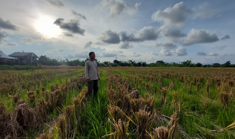 Musa, petani padi di Koya Timur sedang berdiri di atas sawah padi yang baru saja dipanen / Euforia.id