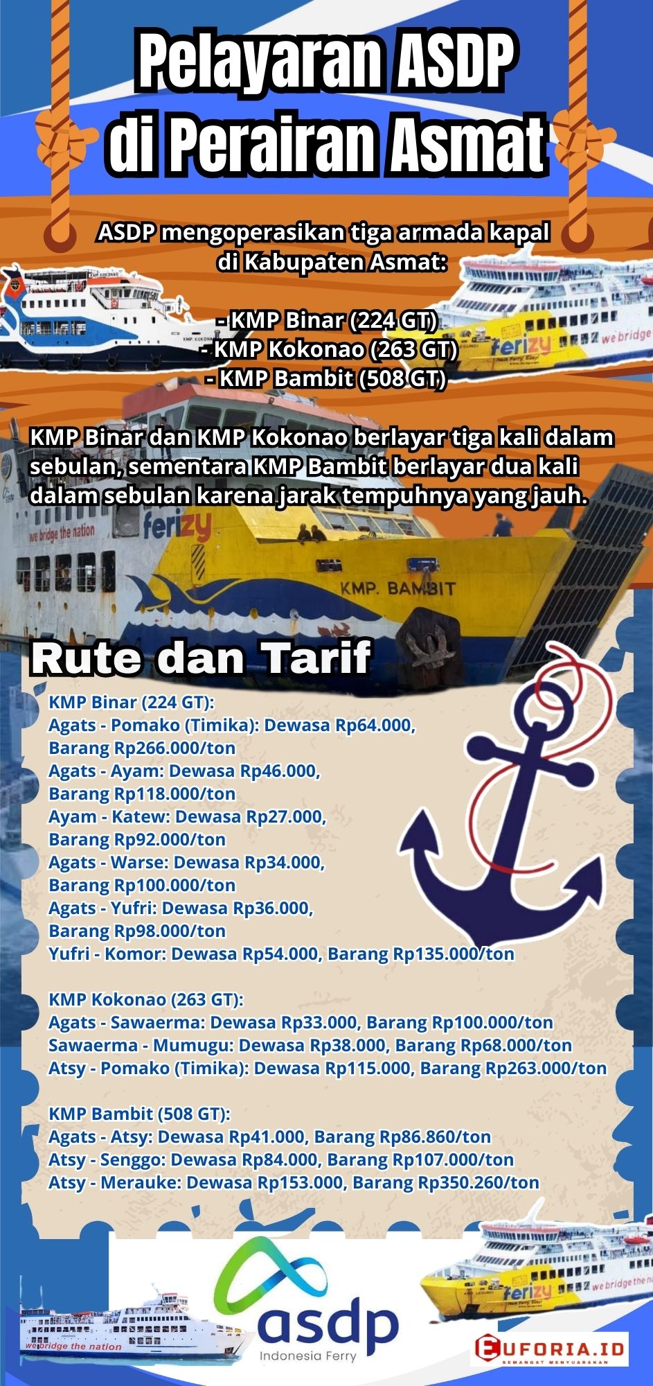 Kini, tiga armada ASDP hadir di Asmat, KMP Binar, KMP Kokonao, dan KMP Bambit, yang selalu setia mengarungi perairan Asmat, menjangkau wilayah pelosok yang sebelumnya sulit diakses.
