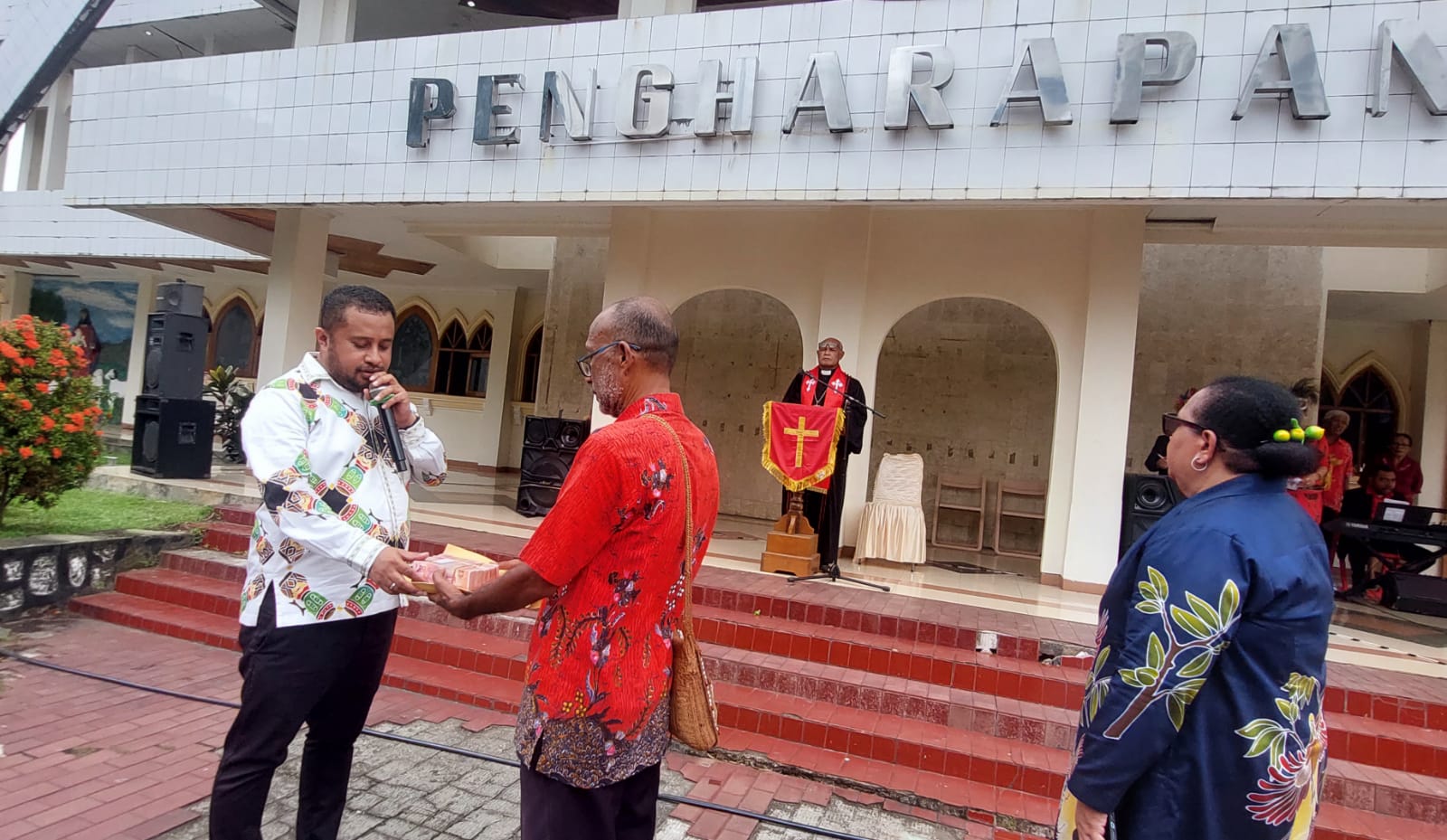 Ketua DPR Papua, Denny Henrry Bonai menyerahkan bantuan uang tunai untuk pembangunan gedung baru GKI Pengharapan