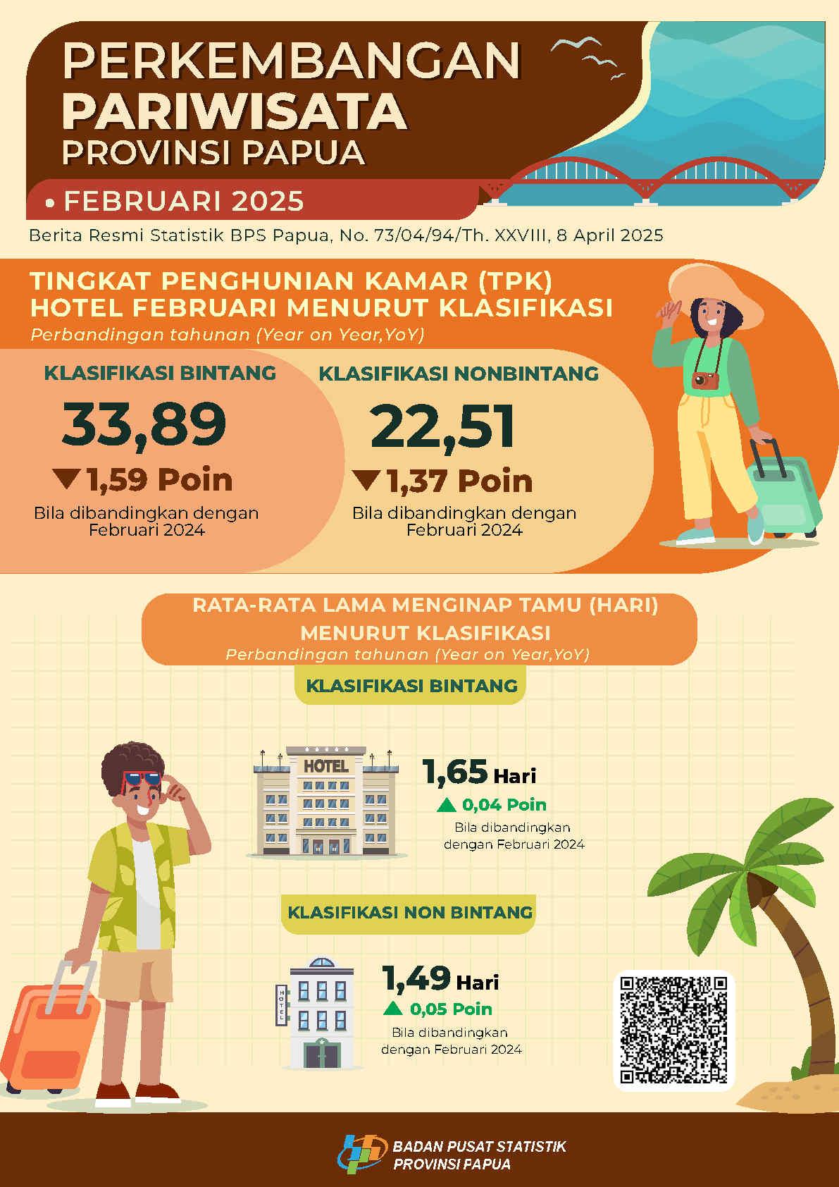Tingkat Penghunian Kamar hotel bintang di Papua selama Februari 2025 mencapai 33,89 persen. Jika dibandingkan dengan bulan yang sama pada tahun sebelumnya, TPK hotel bintang pada Februari 2025 turun sebesar 1,59 poin.