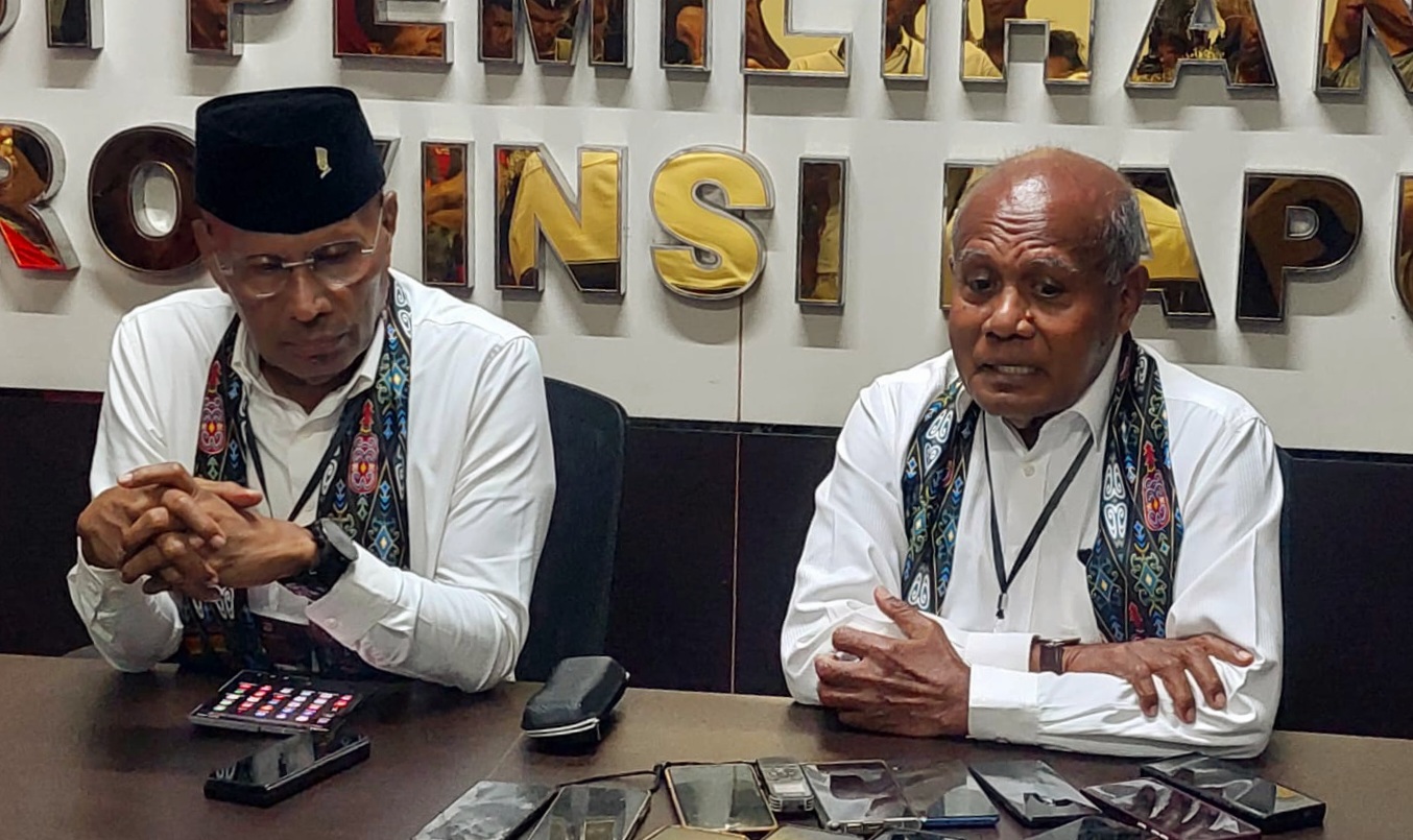 Benhur Tomi Mano dan Constant Karma saat memberikan keterangan pers usai mendaftar di Kantor KPU Papua